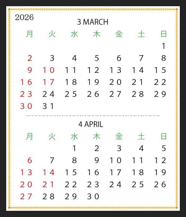 2026 / 3月 / 4月のカレンダーです。